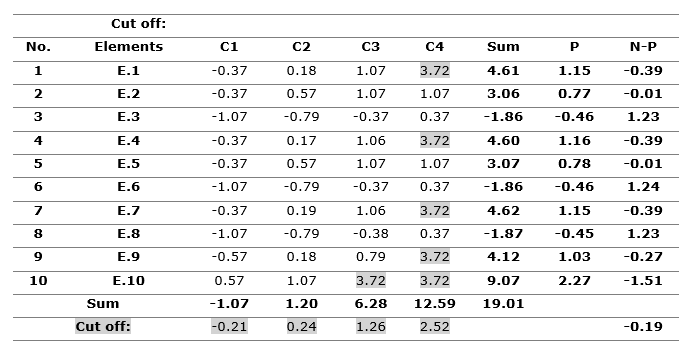 The cut off values were obtained by dividing the sum of the corresponding values to every column between the pass number (relative average), where N-P is the average value given by the specialists consulted between tests. The cut off values were the limits among which the mean value may vary, as given N-P by question in every evaluating category, according to the method.