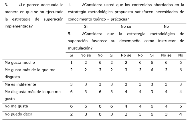 El análisis de los resultados evidenció que la aplicación de la estrategia metodológica de superación profesional para los instructores de gimnasios de musculación resulta factible y cumple con el objetivo propuesto, que repercute en el mejoramiento de los servicios del instructor. Las preguntas abiertas formuladas en el cuestionario, permitieron confirmar la tendencia favorable de los instructores de musculación hacia la superación profesional recibida, efectos que se constatan con los resultados obtenidos en el índice de satisfacción individual. Los aspectos resultantes de esta estuvieron relacionados con el buen aprovechamiento del tiempo, la profesionalidad, preparación teórica y práctica de los profesores y especialistas que desarrollaron la estrategia y sus contenidos. Resaltaron la variedad de las actividades y su carácter novedoso e integrador. El 77 % de los participantes coincidió en la importancia de la sistematicidad en acciones de superación para actividades futuras.