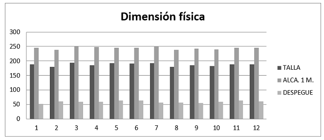 Lo expuesto se hace evidente al valor el estado físico de las atletas desde la dimensión física, como muestra el gráfico 1. Donde la información adquirida en alcance y despegue, la media de las investigadas se encuentra por debajo de los valores que establece la Federación Cubana de Voleibol (FCVB) (Gráfico 1).