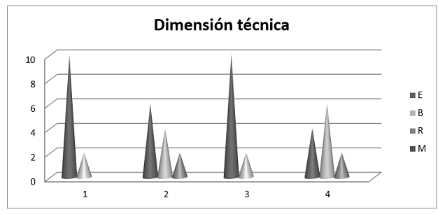 En tanto la dimensión técnica y sus indicadores, se ven afectados en la misma medida, ya que el 25 % de la población se encuentra evaluada de mal, el 41,6 % evaluada de bien, de manera general. Los indicadores más afectados corresponden al 1.2 Longitud del paso y el 1.4 despegue y caída, respectivamente (Gráfico 2).