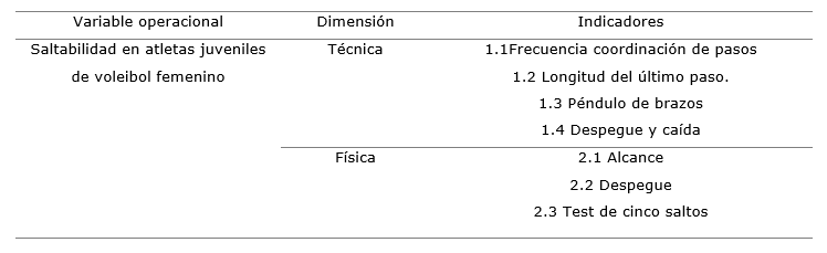 Las dimensiones anteriores posibilitan que se pueda valorar el comportamiento de la saltabilidad en la ejecución del remate delantero, y a la vez, establecer los indicadores y criterios valorativos, de donde emergen las interrogantes mostradas en cada instrumento. En la investigación que se presenta, se aplicaron diversos métodos científicos de recopilación de la información y su relación con las dimensiones establecidas; ellos fueron la revisión documental a las principales orientaciones emitidas por el PIPD para el voleibol y artículos referenciales acerca del tratamiento a la temática, la observación a competencia, la medición donde se aplica el test de cinco saltos no es más que las atletas realizan cinco saltos a varias chapas colgantes que reflejan diferentes alturas, con el fin de conocer el máximo salto y el promedio entre los cinco saltos, y de crear un nivel competitivo individual, colectivo, la triangulación metodológica para establecer regulaciones en la información aportada en la indagación.