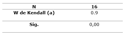 Se calcula además el coeficiente de concordancia de Kendall W para medir el grado de concordancia de los especialistas en las respuestas emitidas, reflejados en la tabla 2. Al respecto se puede apreciar que existe concordancia entre las respuestas brindadas con respecto a los indicadores de evaluación pues W alcanza un valor de 0,9 y su significación de 0,00 < 0,01 lo que garantiza que esa concordancia no es casual. (Tabla 2).