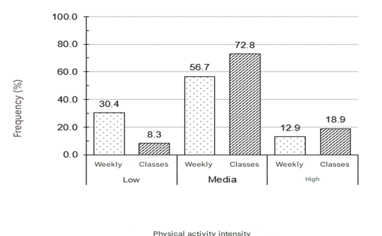 Figure 1 shows that the comparison between the level of intensity of physical activity in both contexts was of moderate intensity, with 56.7 % (over the course of the seven days of the week) and 72.8 % (during physical education class) practiced by schoolchildren from the Ayacucho region (Figure 1).