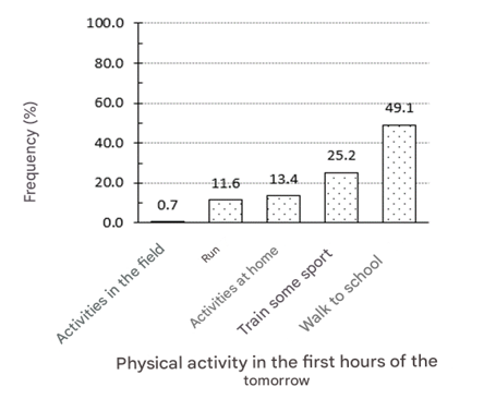 Figure 2 shows that walking to school (49.1 %) is the most frequently practiced physical activity during the early hours of the morning by schoolchildren in the Ayacucho region (Figure 2).
