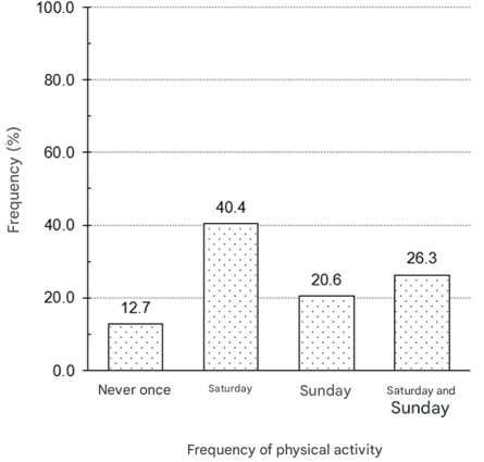 Figure 4. shows that Saturday is the most frequent day for physical activity (40.4%). However, 12.7 % of schoolchildren do not engage in physical activity during the weekend (Figure 4).