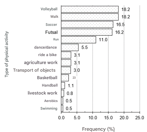 practiced collective physical activities were volleyball (18.22%), football (16.5%), and futsal