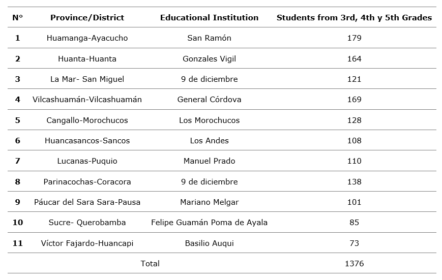 The population consisted of 12,031 secondary education students from eleven provinces in the Ayacucho region. The sample included 1,376 (11.44 %) students from the 3rd, 4th, and 5th grades of secondary education from 11 representative educational institutions in each of the eleven provinces of the Ayacucho region (Table 1).