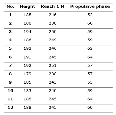 The previous shows the physical condition of the athletes, according to their physical dimension, as shown in graphic 1. The information gathered regarding the reach and propulsive phase showed a mean below the values set up by the Cuban Volleyball Federation (FCVB) (Graphic 1).