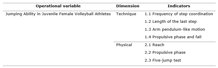 The previous dimensions permitted the assessment of the jumping behavior when attacking from the opposite player, and establish assessing parameters from which the questions in the instruments were made. This research relied on several scientific methods of information collection and its relation to the set dimensions, such as a documentary review of the main volleyball guidelines given by the PIPD, as well as reference papers about this topic. The observation of the competition, the five-jump test consisted of five jumps onto several hanging plates at different heights, in order to record the top jump and the average of the rest. It also aimed to create individual and collective competitive ability, the methodological triangulation to set up regulations of the information given in the query.