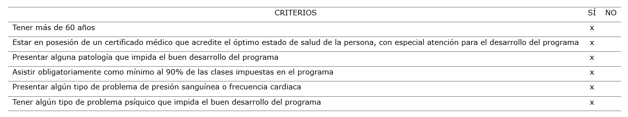 Los asistentes al programa fueron n=16 personas con una media de edad ME=66 años de las cuales todas mujeres del Valle de Baldizarbe, las cuales han desarrollado el programa de forma completa y única en las instalaciones del Camping El Molino de Mendigorria (carretera Larraga s/n, Mendigorria, Navarra). Dichos participantes fueron escogidos a través de una encuesta para valorar si cumplían los criterios de inclusión para el correcto desarrollo de todo el programa de evaluación (Tabla 1).