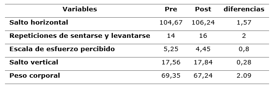 Los resultados estadísticos de la t- student para prueba emparejada indica para la variable salto horizontal pre104.67 y post 106.24; en la variable repeticiones de sentarse y levantarse de la silla pre 14 y post 16; en la variable escala de esfuerzo percibido pre 5.25 y post 4.25; por el ultimo, en las variables salto vertical pre 17,56 y post 17, 84. Los resultados inferenciales de la prueba t-student para muestras emparejadas indican t=-0,248; p=0.408 no significativa. Lo que indica que el programa de no ha tenido los resultados esperados Tabla 3.