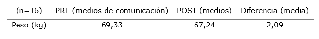 En primer lugar, se muestra la evolución del peso medio de los participantes de la intervención, de forma previa y posterior a la misma (Tabla 4). Como se puede observar, la media en kg de los participantes de forma previa a la intervención fue de 69,33 kg, por su parte, la media de forma posterior a la misma fue de 67,24. Por tanto, la diferencia media de peso generada tras la intervención fue de 2,09 kg.