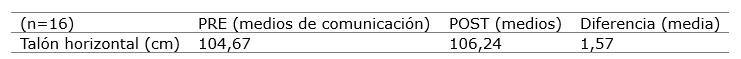 Seguidamente se desarrollan los resultados de la prueba de salto horizontal realizada, medida en centímetros (cm), indicándose, igualmente, las medias llevadas a cabo por los participantes de forma previa y posterior a la intervención (Tabla 6). Como se puede ver, la media de salto horizontal de forma previa fue de 104,67 cm, la media posterior a la intervención fue de 106,24 cm, y finalmente, la diferencia pre-post generada fue de 1,57 cm. Destacar el mayor incremento experimentado siendo horizontal en comparación con el anterior análisis del salto vertical.