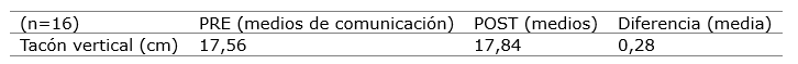 A continuación, se muestran los resultados de la prueba de salto vertical realizada, medida en centímetros (cm), indicándose, igualmente, las medias llevadas a cabo por los participantes de forma previa y posterior a la intervención (Tabla 5). Como se puede ver, la media de salto vertical de forma previa fue de 17,56 cm, la media posterior a la intervención fue de 17,84 cm, y finalmente, la diferencia pre-post generada fue de 0,28 cm.