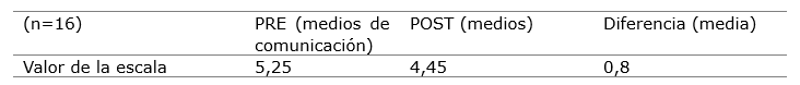 Por último, se llevó a cabo un análisis de la escala de esfuerzo percibido (del 1 al 10) siendo el 1 el valor mínimo y 10 el valor máximo. Se midió, en base a dicha escala, la media total de forma previa y de forma posterior a la intervención. Como se puede observar en la Tabla 8, de forma previa los participantes alcanzaron un valor de 5,25, posteriormente a la intervención dicho valor disminuyó hasta 4,45, estableciéndose la diferencia en una cifra de 0,8 menos.