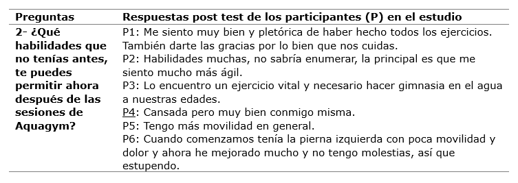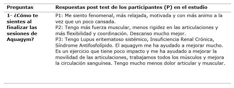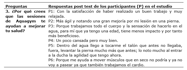 Para apoyar los resultados cuantitativos se recogieron unas series de preguntas realizadas por el investigador con el fin de poder aumentar la fiabilidad de los resultados. Las preguntas realizadas fueron: ¿Cómo te sientes al finalizar las sesiones de Aquagym? ¿Qué habilidades que no tenías antes, te puedes permitir ahora después de las sesiones de Aquagym? ¿Por qué crees que las sesiones de Aquagym te ayudan a mejorar tu salud? (Tabla 9).