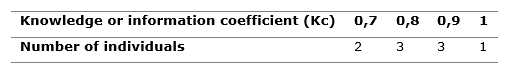 To obtain the knowledge coefficient for each expert (Table 1), the rating given by each expert on a scale of zero to ten regarding their knowledge of the subject is multiplied by 0.1 (divided by 10). Thus: