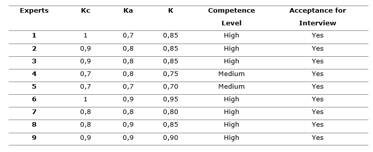 Results of the level of competence of potential experts based on the knowledge coefficient (kc) and argumentation coefficient (ka) (Table 3).