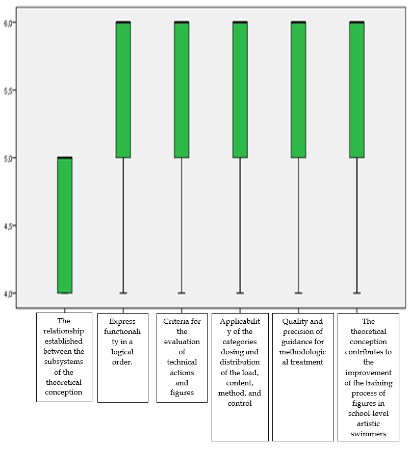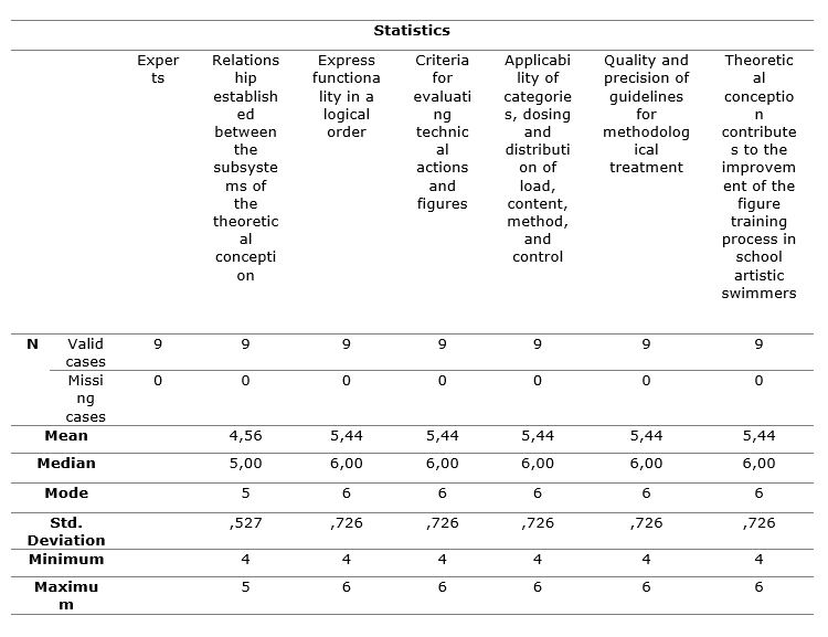 Out of the nine experts: one holds a Ph.D. in Physical Culture Sciences with a full professor teaching category, two are specialists, and six are Bachelor's degree holders in Physical Culture. The average work experience is 23 +/- 5 years, with a minimum of 17 and a maximum of 30. Eight are artistic swimming coaches, and one holds the position of national technical chief. Once the experts were determined, to provide criteria and value judgments on the designed concept, a copy of the theoretical conception was sent to them. The aim was to assess their evaluative criteria regarding the feasibility of the contributions made in the research.