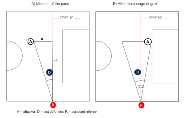 Although á is the angle that makes it possible to correctly judge the possible offside, it is not the angle that the assistant referee perceives according to the hypothesis of the change of gaze. Indeed, according to this theory, the assistant referee is able to fix his gaze on the last defender and evaluate the relative position of the attacker milliseconds after the pass, when the latter has already advanced towards the opponent's goal and the angle formed between the two players has changed (Figure 1, Panel B).