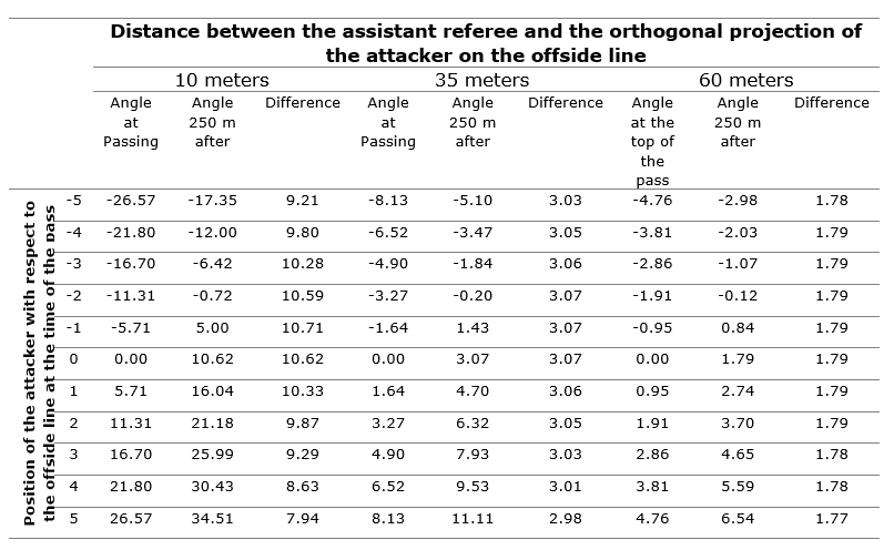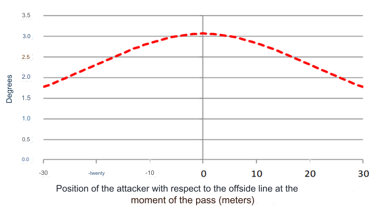 Firstly, calculations show that the perceived angle, from the position of the assistant referee, between the attacker and the last defender, at the time of the pass, is an increasing function of the distance between the attacker and the offside line. For example, if the attacker runs through the center of the field and is 5 meters behind the offside line the angle will be -8.13 degrees. As the player advances, the amplitude decreases until it reaches zero and then begins to increase as the player crosses the offside line.
