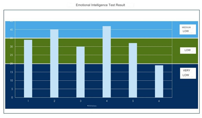 The results of the test indicated that emotional intelligence, as a concept, was at a low level in three athletes and at a medium-low level in the other half (Figure 1). This confirms the poor development of these skills in the athletes expressed by the coaches and observed during training.