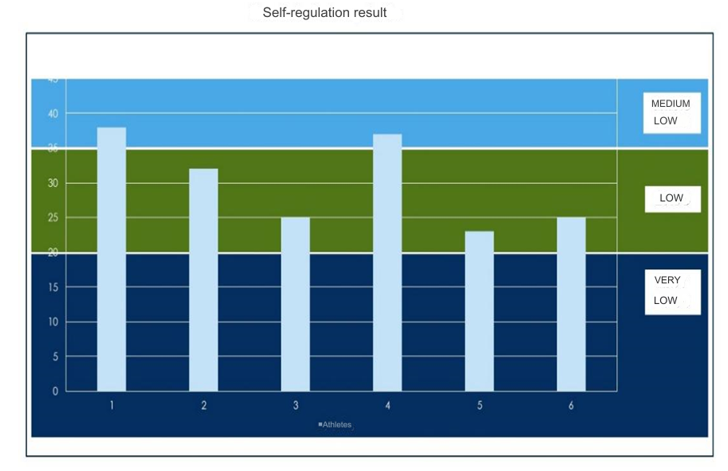 Similarly, the self-regulation dimension also exhibited low levels, with the remaining scores being moderately low. This confirms similar findings across other techniques, demonstrating a lack of emotional stability during matches. This is corroborated by the observed lack of independence, optimism, initiative, decisiveness during competition, and an imbalance in the change of pace during actions. Athletes 3, 5, and 6 reported that when they strive for good performance and fail, they lack the motivation to continue striving for excellence. They struggle to let go of past mistakes, resulting in a lack of coordination and fluidity that they begin to experience after these events (Figure 3).