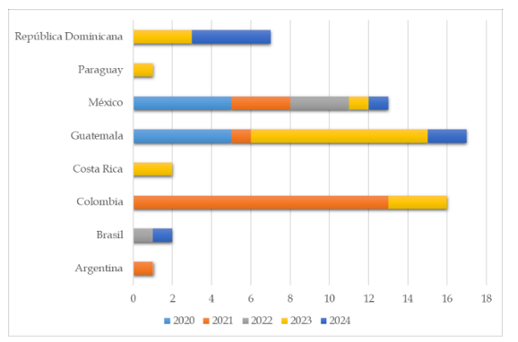 En la figura 1, se aprecia con claridad que Guatemala es el país que más piezas públicas; asimismo, llama la atención que en 2023 y 2021, hay más socialización de este tipo de contenidos visuales. Es importante enfatizar que, no existe una periodicidad de publicación de estas piezas comunicativas, que es una forma de afianzar la atención y seguimiento de temáticas de parte de los ciudadanos que consumen este tipo de recursos de información (Universitat Oberta de Catalunya, s f. (Figura 1).