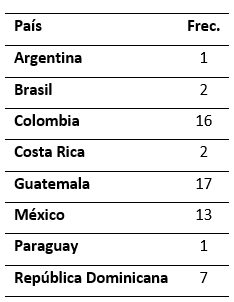 Se implementó un muestreo no probabilístico por bola de nieve, en tanto que se fueron ubicando los infográficos en los sitios electrónicos oficiales como páginas web o redes sociales de los gobiernos citados. Así, se recuperaron 59 infografías publicadas por los gobiernos latinoamericanos con menor nivel de activación física. La concentración de piezas observadas se aprecia en la Tabla 1.
