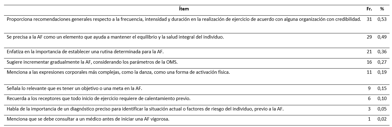 En relación con el contenido que exponen los infográficos sobre las recomendaciones que se exponen a las personas, para que realicen AF, 7 de cada 10 piezas señalan recomendaciones generales de la frecuencia, intensidad y duración con la que se debe practicar un ejercicio, de acuerdo con organismo internacionales. En contraste, solo una pieza pone énfasis en la necesidad de consultar a algún profesional que diagnostique el estado de salud de quien se interesa en comenzar con una práctica vigorosa del ejercicio estos resultados aparecen en la tabla 2. Esto llama la atención, en tanto que la propia OMS (2019, 2021), no solo menciona la AF como una opción de activarse, sino que lo considera un proceso más integral, en donde la nutrición y la asistencia médica, son cruciales para optimizar los beneficios de la AF. Entonces, habría que desarrollar una serie de infográficos que informen sobre todos los aspectos importantes a considerar para lograr una correcta AF (Tabla 2).
