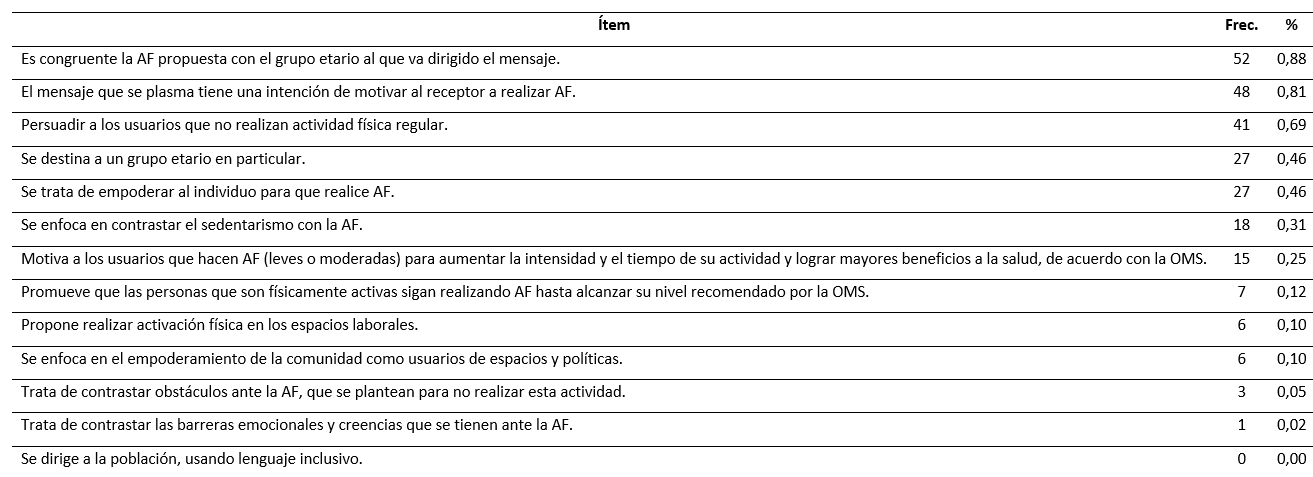 Otro elemento importante para considerar sobre la práctica de la AF es la motivación extrínseca que reciben los individuos para llevar a cabo esta acción. La tabla 3 permite ver cómo el 88 % de las piezas comunicativas analizadas, envían mensajes situados a grupos etarios determinados para que lleven a la práctica la AF, como lo propone Perea-Caballero et al. (2020). Además, hay una tendencia a incentivar a que quienes consultan las infografías, se acerquen a la AF %alrededor del 82 %. Aunque, la redacción del contenido de estos soportes visuales no considera en absoluto el uso del lenguaje inclusivo, a pesar de que hay piezas que se dirigen al público en general (Cala y Navarro, 2011); lo que en este momento constituye un área de oportunidad. Igualmente, se requiere que las entidades gubernamentales envíen mensajes que contrasten con las barreras emocionales que algunos miembros de la sociedad tienen sobre la AF (Tavarnier Morga et al., 2021; World Health Organization, 2022; Quintana Escurra, 2023) (Tabla 3).