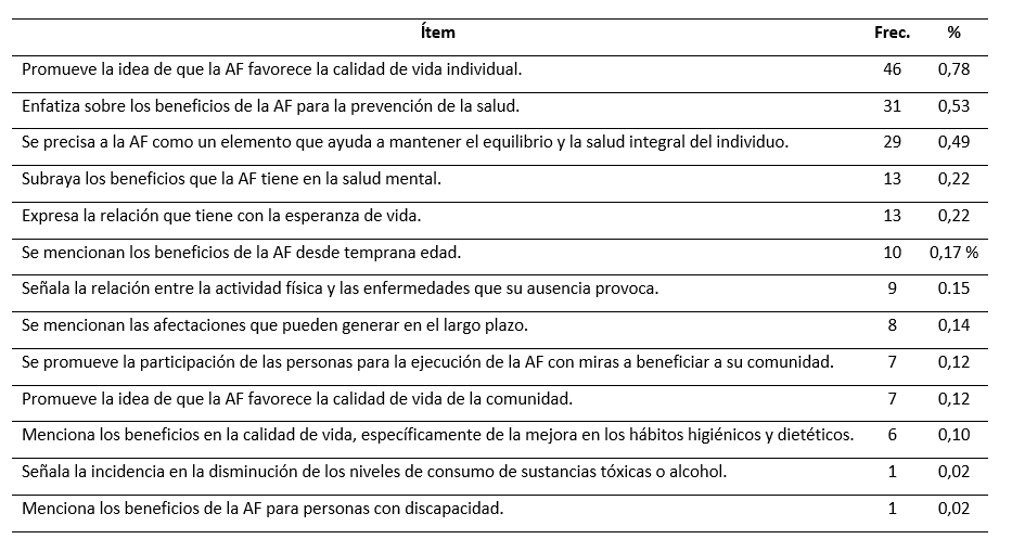 Sobre los beneficios e impacto que tiene la AF, la tabla 4 expone que el 78 % de las infografías que integran este estudio, subrayan cómo esta actividad favorece a lograr estilos de vida saludables 53 % de las piezas (Calpa-Pastas et al., 2019; Peñarrubia-Lozano et al., 2021). No obstante, sobresale la falta de promoción sobre la incidencia que tiene la AF en personas que cursan algún tipo de discapacidad que ya propusieron Muñoz Hinrichsen y Martínez Aros (2022), o como aquellos individuos que buscan disminuir el consumo de sustancias nocivas, como lo señala Valdez Méndez (2015) (Tabla 4).