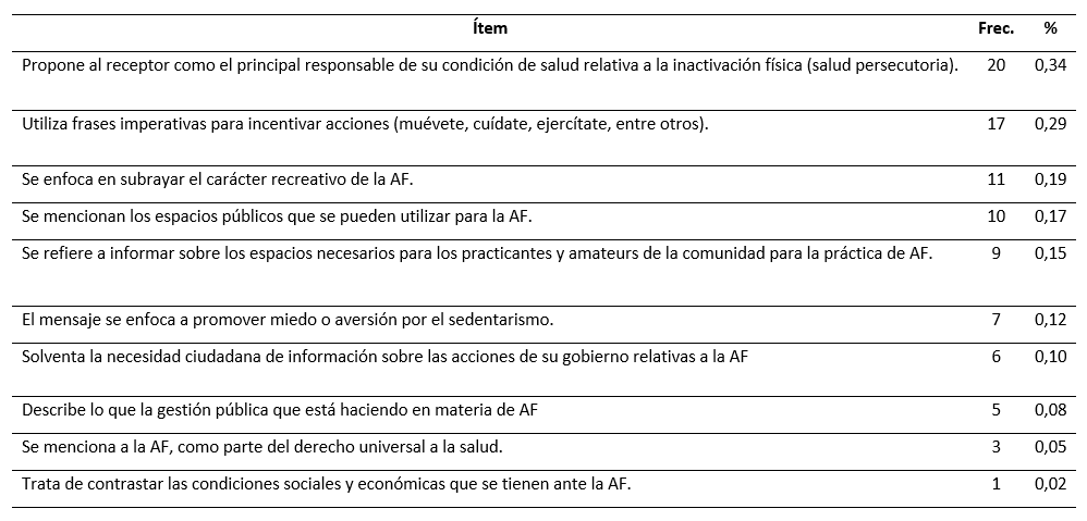 En lo relativo al Gobierno y la comunidad como promotores de la AF, en el diseño de los mensajes, predomina en dos de cada diez piezas el tono de salud persecutoria, en el que se señala al individuo como el principal responsable de su inactividad (Meinardi, 2021). Esto se combina con el uso de frases imperativas que se implementan para incentivar a los ciudadanos a la práctica de la AF. En cambio, en solo un infográfico, se aprecia que el emisor gobierno trata de atender las condiciones sociales y económicas que son factores que disminuyen las posibilidades de AF estudie la tabla 5 para más información. Habría entonces que orientar el contenido de las piezas comunicativas, a una forma de comunicación más corresponsable con el ciudadano (De La Guardia Gutiérrez y Ruvalcaba Ledezma, 2020), en tanto que el estado es quien, dentro de sus obligaciones, debe proporcionar las condiciones de seguridad necesarias para que el individuo se desarrolle plenamente (Rodríguez-Blanco, 2021), lo que incluye la infraestructura en salud y recreación, así como lograr que otras entidades se involucren en la promoción de esta actividad, como las empresas (Gómez-Chacón et al., 2018) o las instituciones educativas (Tabla 5).