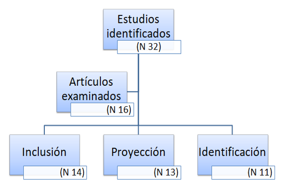 Siguiendo la declaración PRISMA (Page et al., 2021), en el proceso de elegibilidad de los artículos se diferenciaron tres etapas: identificación, proyección e inclusión. La fase de identificación dio como resultado un total de 32 artículos.