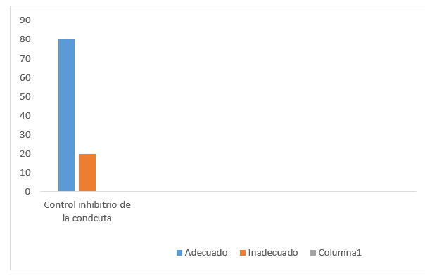 La evaluación del control inhibitorio de la conducta en la población estudiada permitió constatar que el 80 % (12) muestra un rendimiento adecuado en esta función ejecutiva, con todos sus indicadores por encima del 70 % en rangos adecuados. Solo un 20 % (3) de la misma se encuentra en los rangos inadecuados, con mayor incidencia de los indicadores de emisión de respuestas correctas e incorrectas, con un 27 % cada uno (Figura 2).