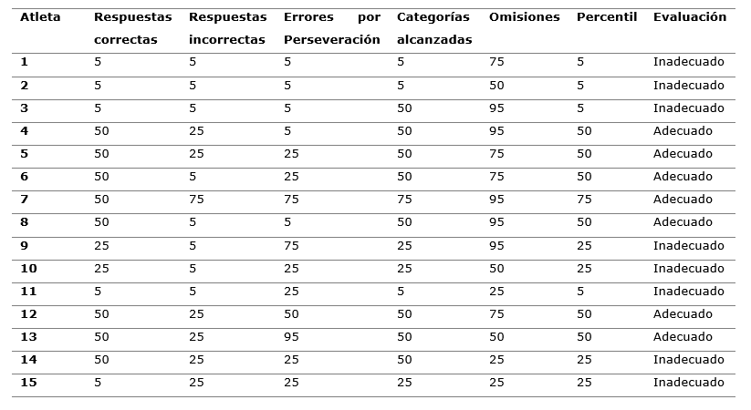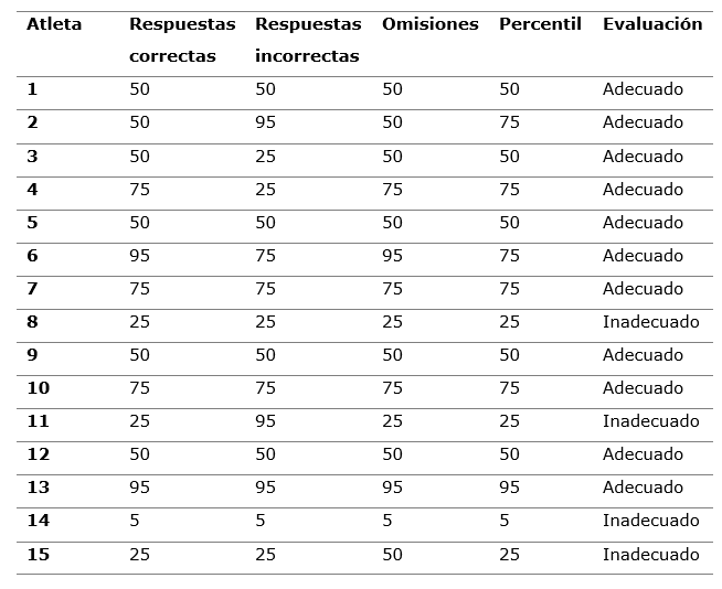 Si bien, al menos, el 50 % de los atletas alcanza registros adecuados en el resto de los indicadores (respuestas correctas, categorías alcanzadas y omisiones), la diferencia con los que obtienen percentiles inadecuados o por debajo de la media esperada para el sexo y la edad, es inferior a 20 % (categorías alcanzadas), excepto en las omisiones, con una diferencia de 40 % (Figura 1).