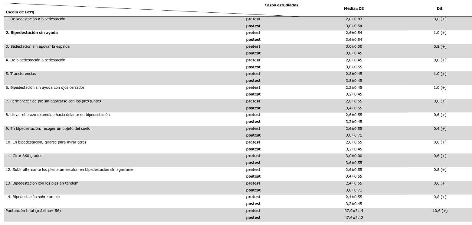 Tabla 1 - Resultados pre y pos test de la escala de Berg