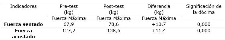 La tabla 2, muestra los datos estadísticos que arrojan tanto el pre-test como el post-test de la fuerza sentado de los paraatletas, donde se observa el incremento de los valores de la media de fuerza máxima, desde el inicio de la preparación hasta el final de la etapa competitiva (Tabla 2).