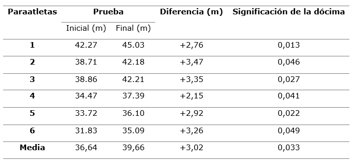 De forma general, en las muestras pareadas del pre-test y pos test, a través del programa estadístico SPSS, versión 22.0, se evaluaron las diferencias entre las muestras de datos. Los resultados del estudio llevan a aceptar la hipótesis experimental; por lo tanto, los resultados antes expuestos expresan una diferencia significativa con una p ≤ 0.05- entre los indicadores del desarrollo de la fuerza rápida en paraatletas de lanzamiento del disco entre el pre-test y el post-test, con mejoras en las marcas correspondientes al post-test.